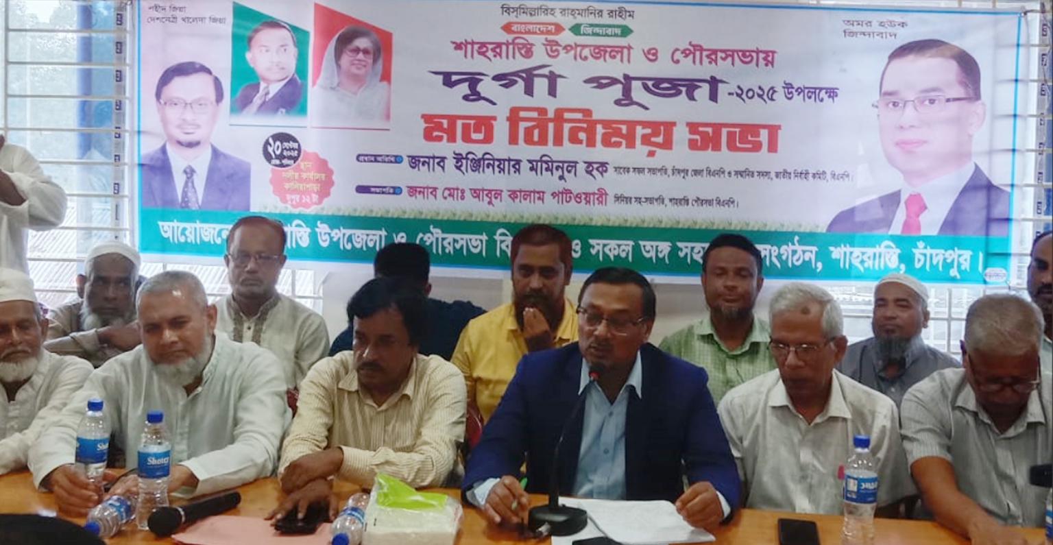 শারদীয় দুর্গাপূজা উপলক্ষে ইঞ্জি. মমিনুল হকের সাথে পূজা উদযাপন কমিটির এক মতবিনিময় সভা অনুষ্ঠিত হয়েছে। ২০ সেপ্টেম্বর শনিবার দুপুরে শাহরাস্তি উপজেলা ও পৌরসভা বিএনপির উদ্যোগে এ মতবিনিময় সভা অনুষ্ঠিত হয়।