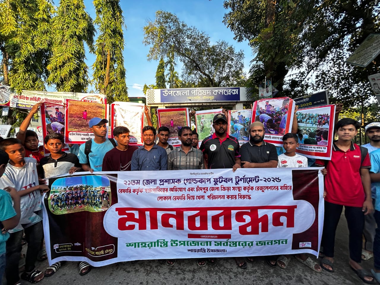 শনিবার (২৭ সেপ্টেম্বর) দুপুরে শাহরাস্তি উপজেলা সদরে অনুষ্ঠিত এই মানববন্ধনে স্থানীয় ক্রীড়াবিদ, খেলোয়াড়, ক্রীড়াপ্রেমী ও বিভিন্ন সামাজিক সংগঠনের নেতৃবৃন্দ অংশ নেন। তারা অভিযোগ করেন, জেলা ক্রীড়া সংস্থার রেজুলেশনে বাইরের অনুমোদিত রেফারি দিয়ে ম্যাচ পরিচালনার কথা থাকলেও সেটি অমান্য করে স্থানীয় রেফারি নিয়োগ দেওয়া হয়েছে। এর ফলে মাঠে নিরপেক্ষতা হারিয়ে গিয়ে পক্ষপাতিত্বের ঘটনা ঘটে, যা প্রতিযোগিতার মান ও মর্যাদা ক্ষুণ্ণ করছে।