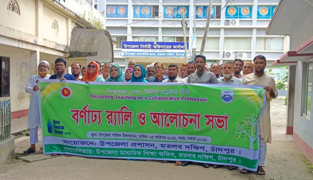 ‘শিক্ষকতা পেশা; মিলিত প্রচেষ্টার দীপ্তি’ এ প্রতিপাদ্য বিষয়কে সামনে রেখে মতলব দক্ষিণ উপজেলায় বিশ্ব শিক্ষক দিবসে বর্ণাঢ্য র্যালী ও আলোচনা অনুষ্ঠিত হয়েছে। র্যালিটি গুরুত্বপূর্ণ সড়ক প্রদক্ষিণ শেষে উপজেলা পরিষদ মিলনায়তনে শেষ হয়।