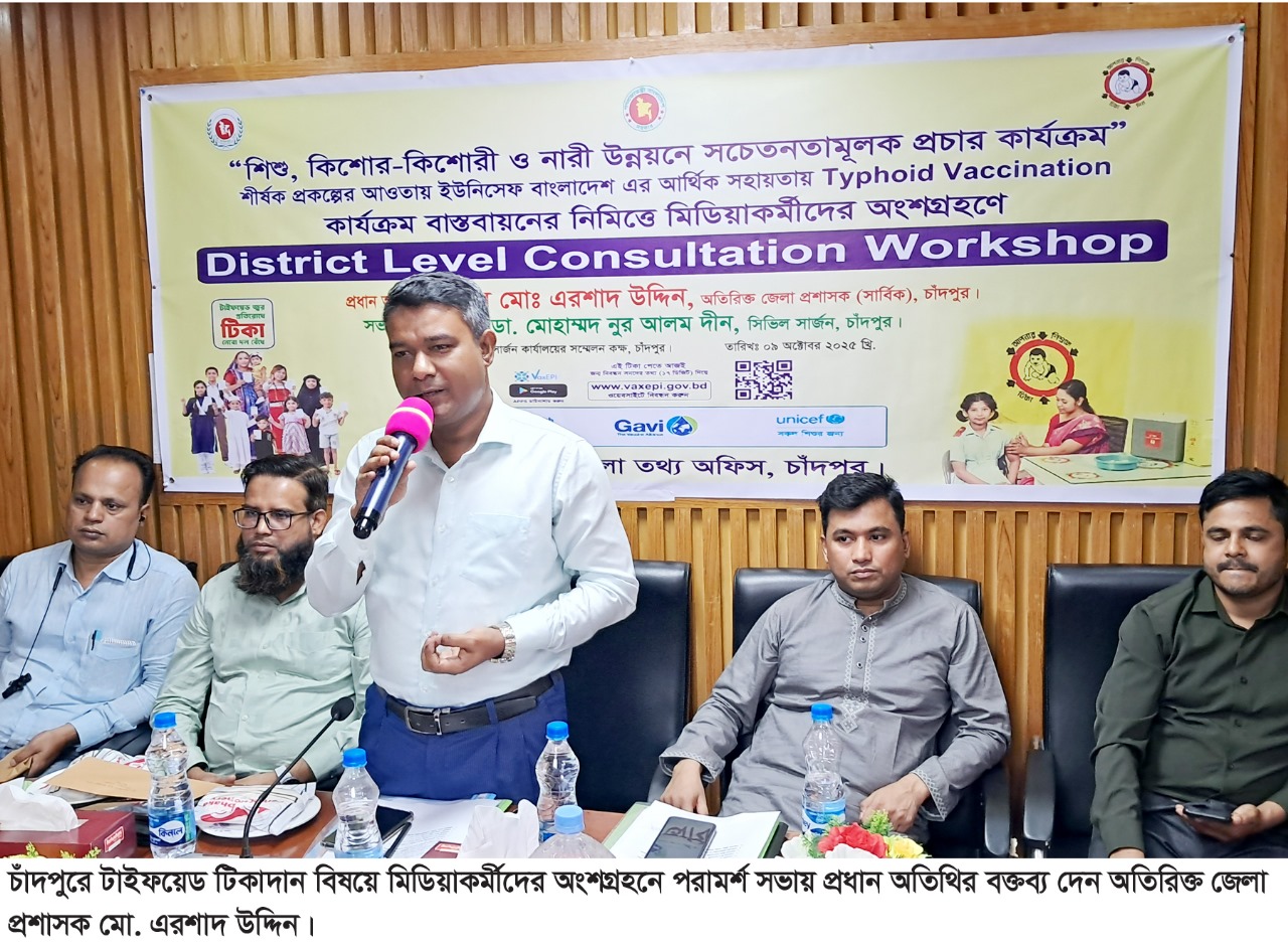 চাঁদপুরে ‘শিশু, কিশোর-কিশোরী ও নারী উন্নয়ন সচেতনতামূলক প্রচার কার্যক্রম’ শীর্ষক প্রকল্পের আওতায় ইউনিসেফ বাংলাদেশ এর আর্থিক সহায়তায় টাইফয়েড ভ্যাকসিনেশন কার্যক্রম বাস্তবায়নের নিমিত্তে মিডিয়াকর্মীদের অংশগ্রহনে জেলা পর্যায়ে পরামর্শ সভা অনুষ্ঠিত হয়েছে। জেলায় এই টিকা প্রদানে টার্গেট শিশুর সংখ্যা ৮লাখ ৫হাজার ২শ’ ৪৫জন।