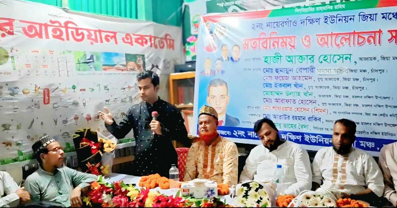 চাঁদপুরের মতলব দক্ষিণ উপজেলার ২ নং নায়েরগাঁও দক্ষিণ ইউনিয়নে জিয়া মঞ্চের উদ্যোগে এক মতবিনিময় ও আলোচনা সভা অনুষ্ঠিত হয়েছে।