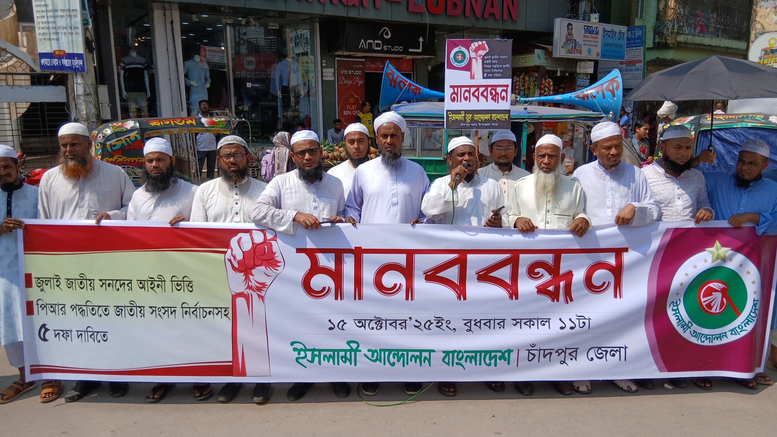 আগামী জাতীয় নির্বাচনে ৫ দফা দাবি বাস্তবায়নের দাবিতে ইসলামী আন্দোলন বাংলাদেশ চাঁদপুর জেলা শাখার উদ্যোগে মানববন্ধন অনুষ্ঠিত হয়েছে।