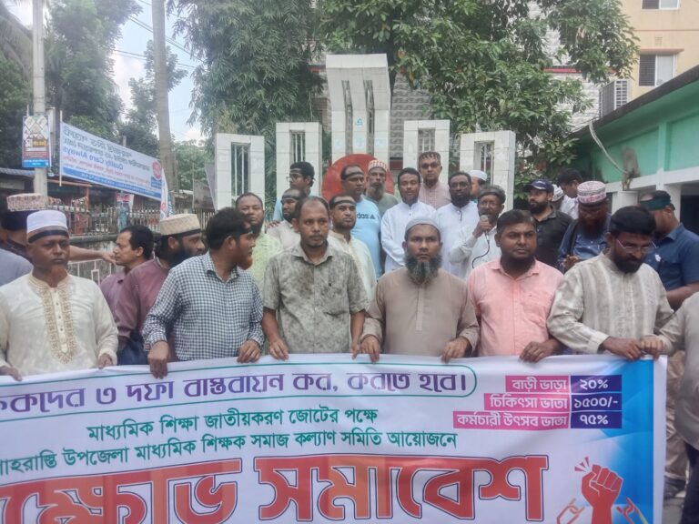 সারাদেশের ন্যায় শাহরাস্তির এমপিওভুক্ত সকল বেসরকারি শিক্ষাপ্রতিষ্ঠা শার্টডাউন ঘোষণা অব্যাহত থাকবে ঘোষণা দিয়েছেন, উপজেলা মাধ্যমিক শিক্ষক- সমিতির সভাপতি মোঃ আব্দুর রহিম। সারাদেশে এমপিওভূক্ত বেসরকারি শিক্ষাপ্রতিষ্ঠানের শিক্ষক-কর্মচারীদের বাড়ি ভাড়া ২০% বৃদ্ধি, চিকিৎসা ভাতা ১৫০০/- এবং কর্মচারীদের উৎসব ভাতা ন্যূনতম ৭৫/-% বৃদ্ধি সহ অন্যান্য দাবিতে কেন্দ্রীয় কমিটির ধারাবাহিক আন্দোলনের অংশ হিসেবে শাহরাস্তি উপজেলায় এক বিক্ষোভ সমাবেশ অনুষ্ঠিত হয়েছে।মঙ্গলবার (২১ অক্টোবর) সকাল ১০:৩০ ঘটিকায় শাহরাস্তি উপজেলার এমপিওভূক্ত শিক্ষাপ্রতিষ্ঠান “শাহরাস্তি উপজেলা মাধ্যমিক শিক্ষক-কর্মচারী সমাজ কল্যাণ সমিতির” কর্তৃক আয়োজিত উক্ত সমাবেশ স্থানীয় ‘মেহার উচ্চ বিদ্যালয়’ প্রাঙ্গণ থেকে শুরু করে উপজেলা পরিষদ মাঠে এসে এক সংক্ষিপ্ত বক্তব্যের মধ্যদিয়ে ঔই বিক্ষোভ সমাবেশ শেষ হয়।শাহরাস্তি মাধ্যমিক শিক্ষক সমিতির সভাপতি মোঃ আব্দুর রহিমের সভাপতিত্বে ও সাধারণ সম্পাদক মোঃ জসিম উদ্দিন এমএসসির পরিচালনায় সভাপতি তার বক্তব্যে বলেন, কেন্দ্রীয় পূর্ব ঘোষণা অনুযায়ী শাটডাউন অব্যাহত থাকবে। এসময় তিনি আরও বলেন, আমাদের দাবি না মানা পর্যন্ত শাহরাস্তি উপজেলার এমপিওভূক্ত সকল বেসরকারি শিক্ষাপ্রতিষ্ঠানের তালা বন্ধ থাকবে, কোন কোচিং ক্লাস পরিচালিত হবে না, প্রাইভেট পড়ানো বন্ধ থাকবে। আমরা আমাদের দাবি আদায় না হওয়া পর্যন্ত ঘরে ফিরবো না।