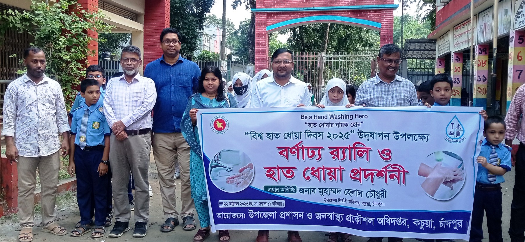 কচুয়া উপজেলা প্রশাসন ও উপজেলা জনস্বাস্থ্য প্রকৌশল অধিদপ্তরের উদ্যোগে বিশ্ব হাত ধোয়া দিবস উদযাপন উপলক্ষ্যে বর্ণাঢ্য র্যালি, আলোচনা সভা ও হাত ধোয়া প্রদর্শনী অনুষ্ঠিত হয়েছে।