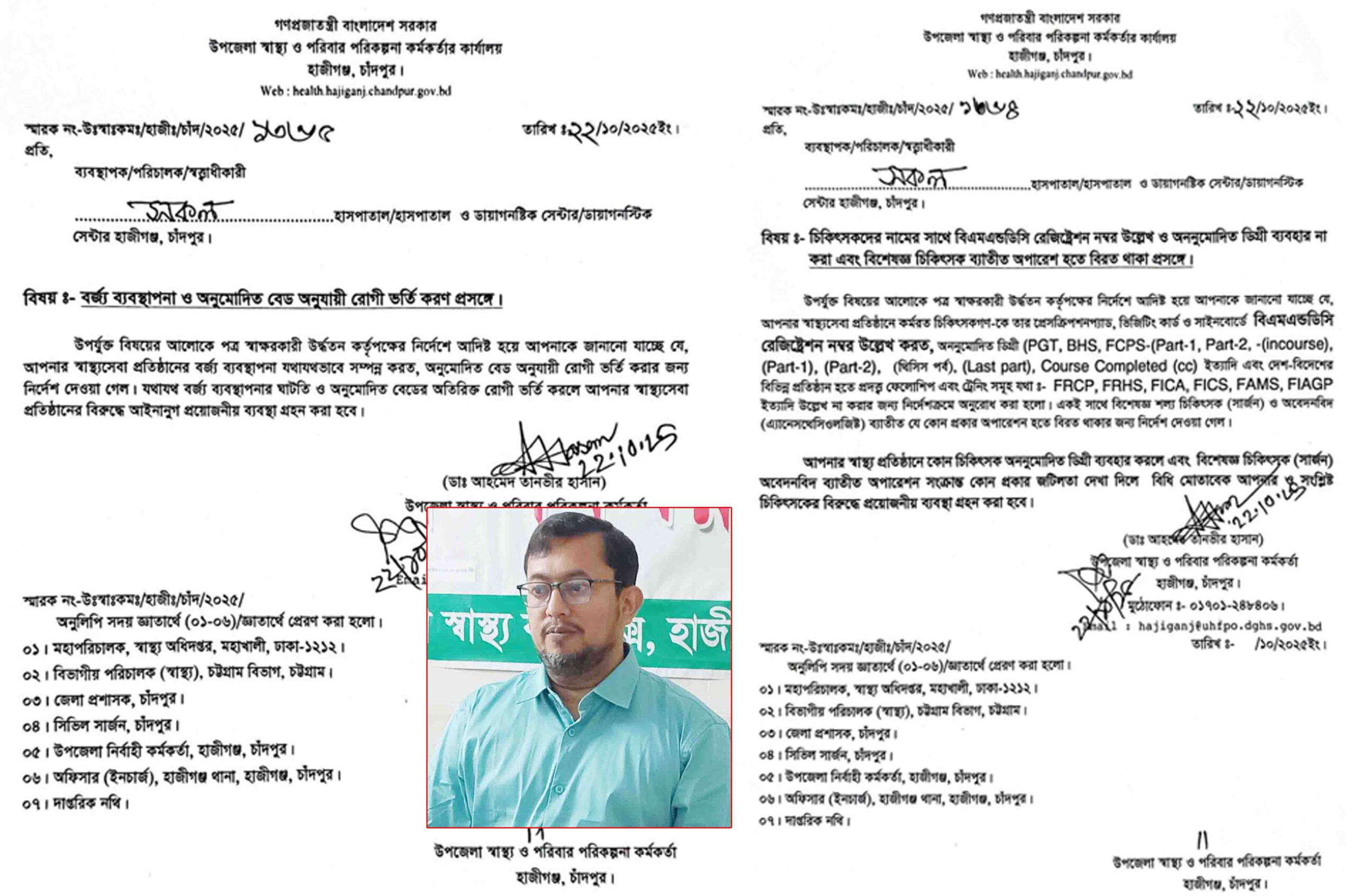 এর মধ্যে ‘বর্জ্য ব্যবস্থাপনা ও অনুমোদিত বেড অনুযায়ী রোগী ভর্তিকরণ প্রসঙ্গে’ বিষয়ক নির্দেশনাপত্রে উল্লেখ করা হয়, আপনার স্বাস্থ্যসেবা প্রতিষ্ঠানের বর্জ্য ব্যবস্থাপনা যথাযথভাবে সম্পন্ন ও অনুমোদিত বেড অনুযায়ী রোগী ভর্তি করার নির্দেশ দেওয়া গেল। বর্জ্য ব্যবস্থাপনার ঘাটতি ও অনুমোদিত বেডের অতিরিক্ত রোগী ভর্তি করলে আইনানুগ ব্যবস্থা গ্রহণ করা হবে। নির্দেশনাপত্রের স্বারক নং- উঃস্বাঃকমঃ/হাজীঃ/চাঁদঃ/২০২৫/১৩৬৪
